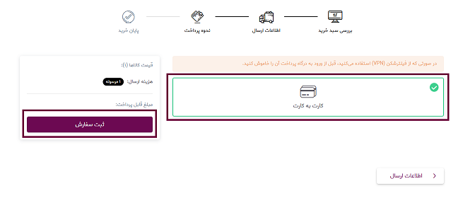 در مرحله بعد پس از ثبت مشخصات خود شامل: نام، نام خانوادگی، شماره موبایل، استان، شهر، کد پستی و آدرس خود جهت ارسال محصول خریداری شده، میتوانید پس از مشاهده قیمت کالا و هزینه ارسال محاسبه شده نسبت به نهایی سازی سفارش خود با انتخاب گزینه نشان داده شده در تصویر اقدام نمایید.