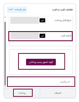 در صورتی که شیوه پرداخت کارت به کارت را انتخاب نموده اید پس از فشار دادن دکمه ثبت سفارش وارد پنجره نشان داده شده در تصویر زیر خواهید شد که از قسمت مشخص شده اطلاعات کارت مقصد قابل مشاهده است. پس از انتقال هزینه کالا، تصویر رسید انتقال وجه را پس از فشار دادن دکمه آپلود تصویر رسید پرداختی در قسمت نشان داده شده بارگذاری نموده و کد پیگیری را نیز در قسمت نشان داده شده وارد کنید و سپس دکمه پرداخت را فشار دهید.