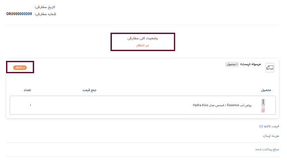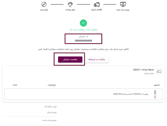 پس از پرداخت، صفحه پایان خرید مطابق با تصویر زیر به نمایش در خواهد آمد که در صورتیکه پرداخت شما با موفقیت انجام شده باشد پیامی تحت عنوان سفارش شما با موفقیت ثبت شد همراه با کد سفارش به شما نشان داده میشود. با فشار دادن دکمه مشاهده سفارش میتوانید مطابق تصویر زیر از وضعیت سفارش خود مطلع گردید